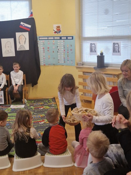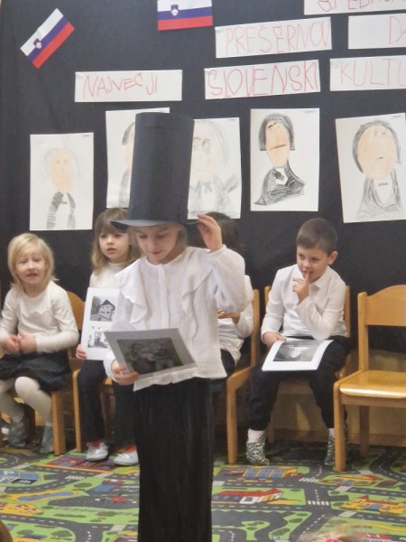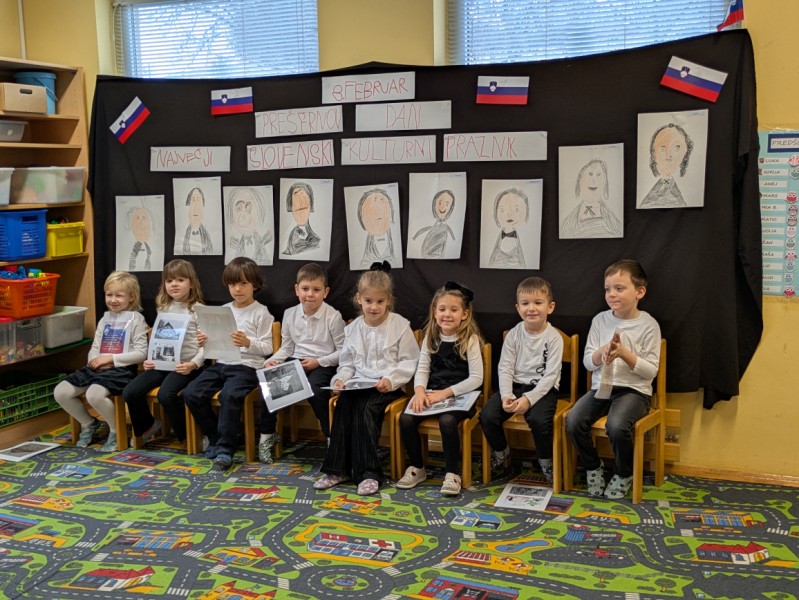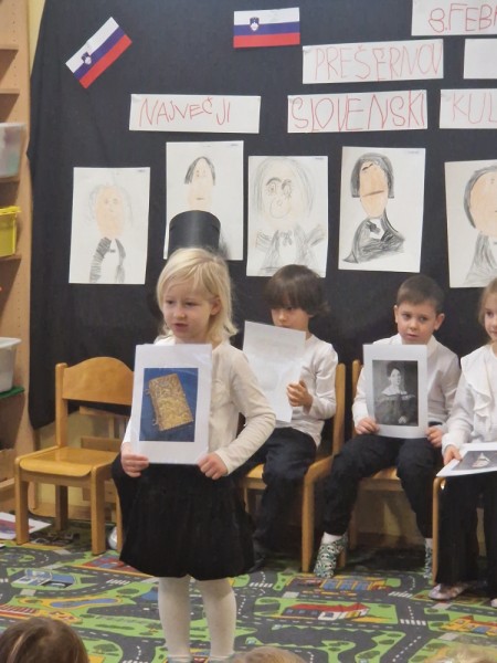 V petek, 6. 2., smo v enoti vrtca v Pesnici obeležili slovenski kulturni praznik – Prešernov dan. Otroci oddelka Ostržki so nas pod mentorstvom oddelčnih vzgojiteljic,skozi doživeto in domiselno predstavitev z uvodno Zdravljico, popeljali v Vrbo na Gorenjskem. Spoznali smo Franceta prešerna, njegove uspehe v šoli, zlato knjigo, utrinke iz njegovega življenja, njegove otroke ter njegovo največjo ljubezen, Primičevo Julijo.. Dogodek je bil prežet z otroško iskrenostjo, ustvarjalnostjo in spoštovanjem do slovenskega največjega Pesnika. Ob prijetnem druženju smo praznično dopoldne zaključili še s sladkimi figami.